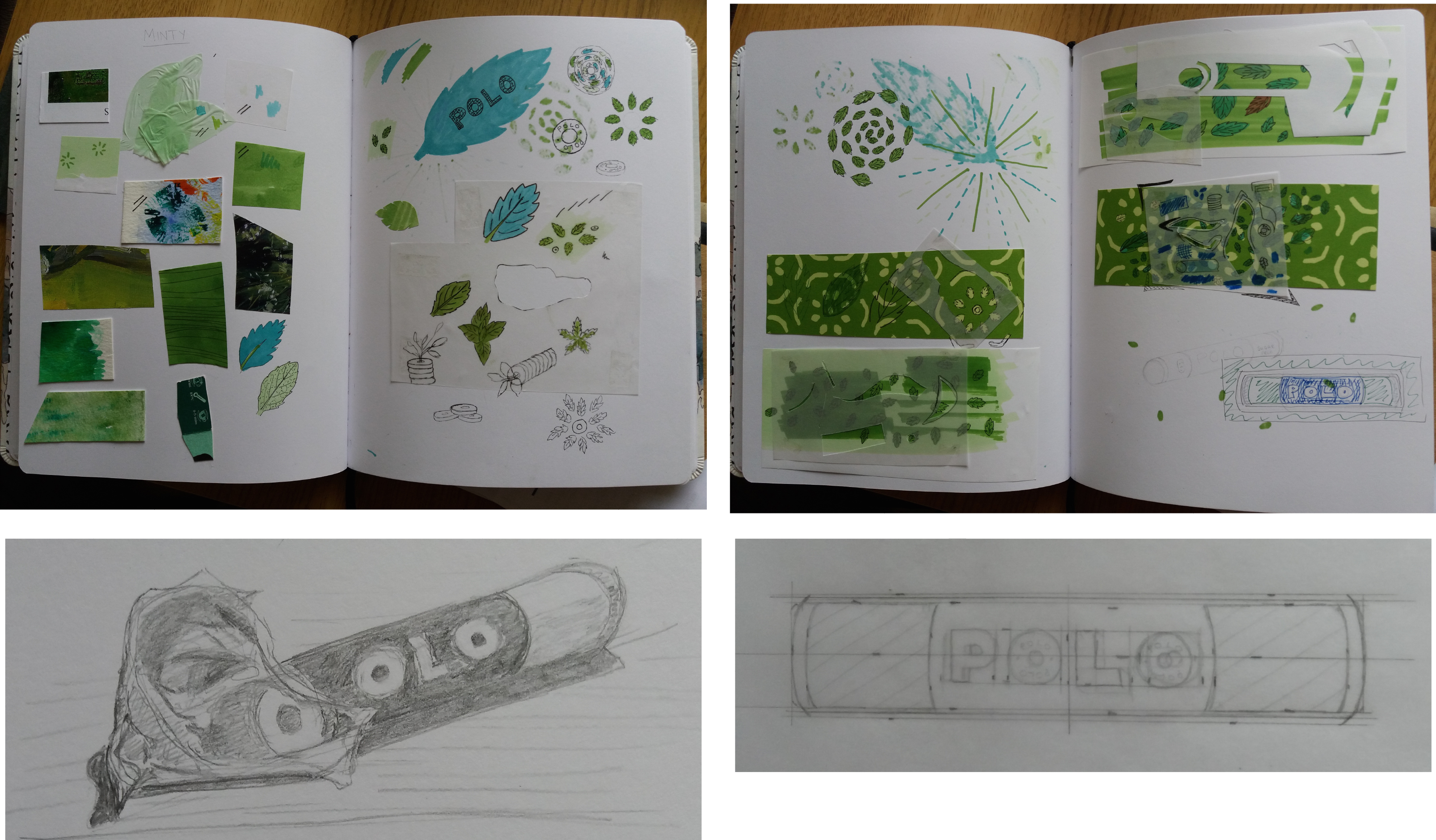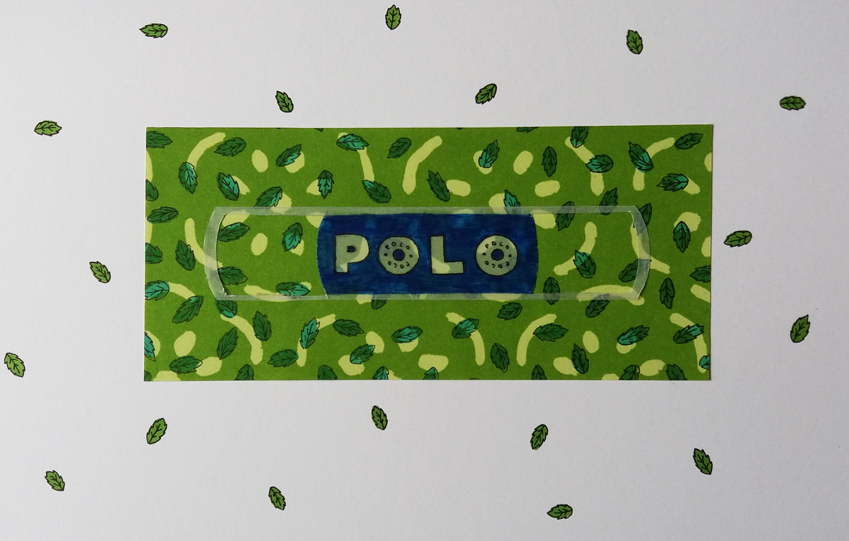 I began by creating a moodboard to investigate different materials, which included, plastics, found papers from magazines and wrapping papers, different paints and pens on different papers. I gradually developed the idea of having a silhouette of the polo tube on a piece of green wrapping paper decorated with mint leaves in pen. I used tracing paper for the silhouette as I wanted to be able to see the decoration underneath. Finally once I’d completed the image I liked the idea of the leaves going beyond the edge of the image in order to highlight them further.